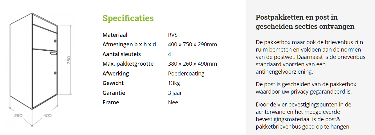 De postpakketbrievenbus wandmodel met elektronisch slot is de perfecte oplossing voor iedereen die pakketten en post veilig wil ontvangen zonder thuis te hoeven zijn. Dit stevige en ruimtebesparende model wordt eenvoudig aan een muur of gevel gemonteerd en biedt maximale bescherming tegen diefstal en weersinvloeden.