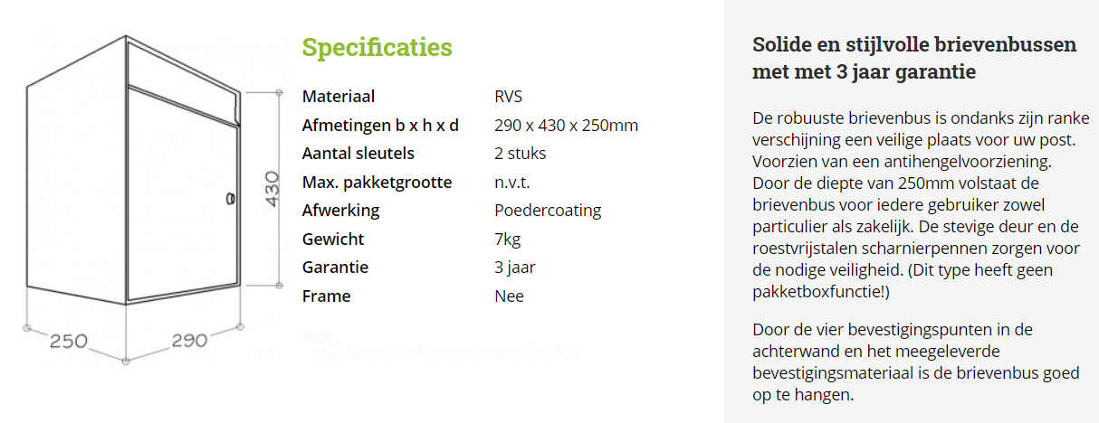| Brievenbus kleur | Antraciet metallic – Ral 29/80081, Gitzwart – Ral 9005, Blank aluminiumkleur – Ral 9006, Zuiverwit – Ral 9010, Dennegroen – RAL 6009 |